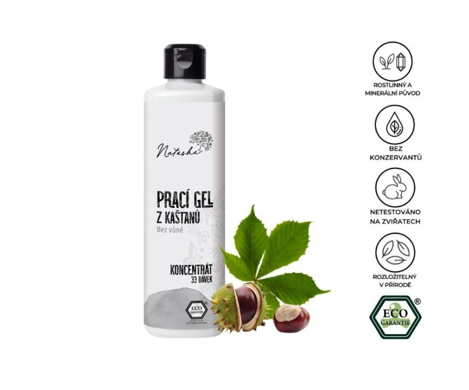 Vysoce koncentrovaný prací gel z koňských kaštanů je skvělý pro šetrné praní přírodních i syntetických materiálů.