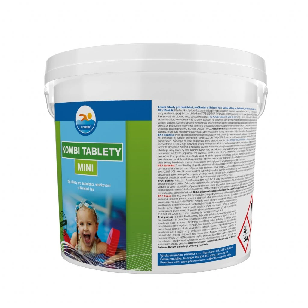 Pak se vloží do plováku, nebo zásobníku tablet 1 ks KOMBI TABLETY MINI na 2-3 m3 vody v bazénu. Toto množství by mělo stačit na udržení potřebné koncentrace 0,3-0,5 mg/l aktivního chloru ve vodě na 5 až 10 dnů v závislosti na faktorech, které ovlivňují množství aktivního chloru ve vodě, jako jsou teplota vzduchu a vody, intenzita slunečního záření a zatížení bazénu